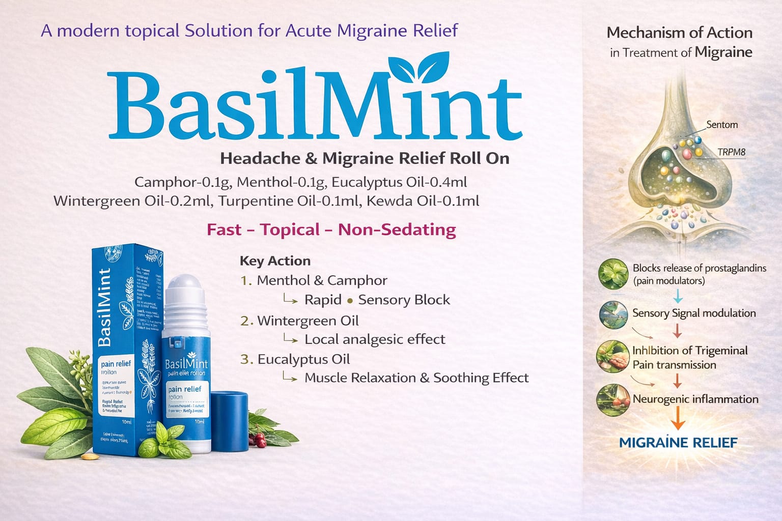 Fast-acting, natural roll-on relief that cools away headache & migraine pain so you can get back to your day faster. Powered by menthol, camphor, eucalyptus and wintergreen for targeted, non-greasy comfort—anytime, anywhere. Skin-friendly, easy-to-carry 10 ml format designed for office, travel and at-home use, without drowsiness or tablets. Trusted, modern headache & migraine solution for patients who want natural relief without compromising on effectiveness.